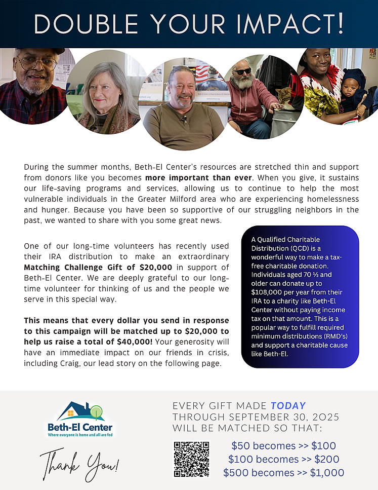 July 21, 2025 - During the summer months, Beth-El Center’s resources are stretched thin and support from donors like you becomes more important than ever. When you GIVE it sustains our life-saving programs and services, allowing us to continue to help the most vulnerable individuals in the Greater Milford area!
